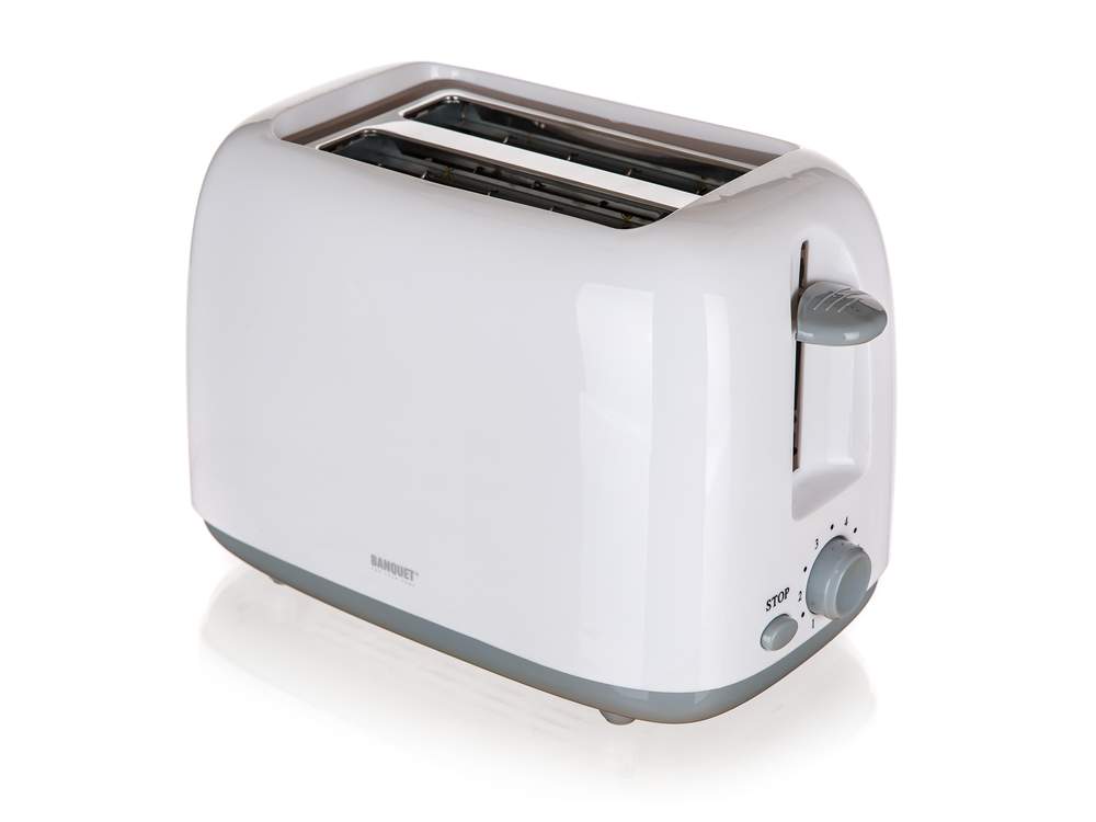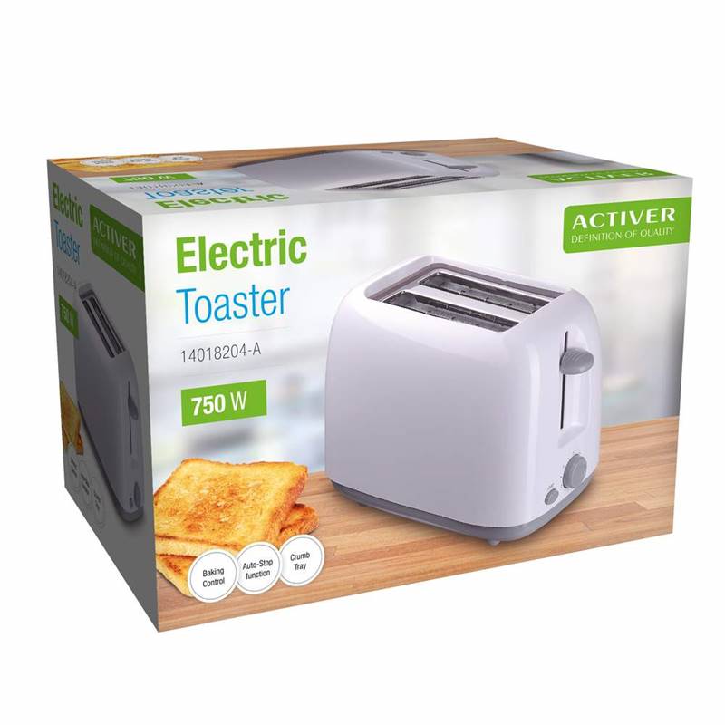 Toaster with timer, 650-750W white The electric 2-slice toaster, 750 W, 6 browning levels, automatic switching-off, button for immediate toasting stop, and removable tray for easy crumb cleaning.