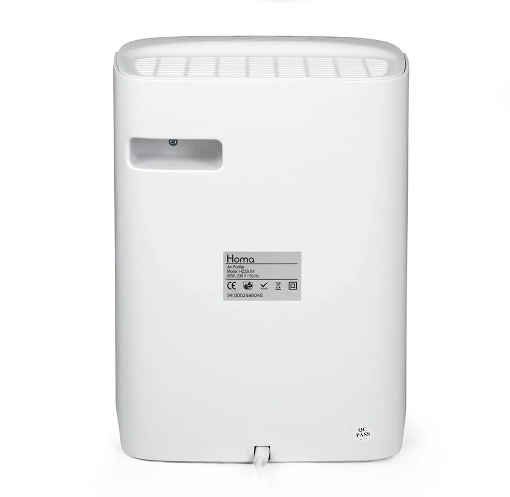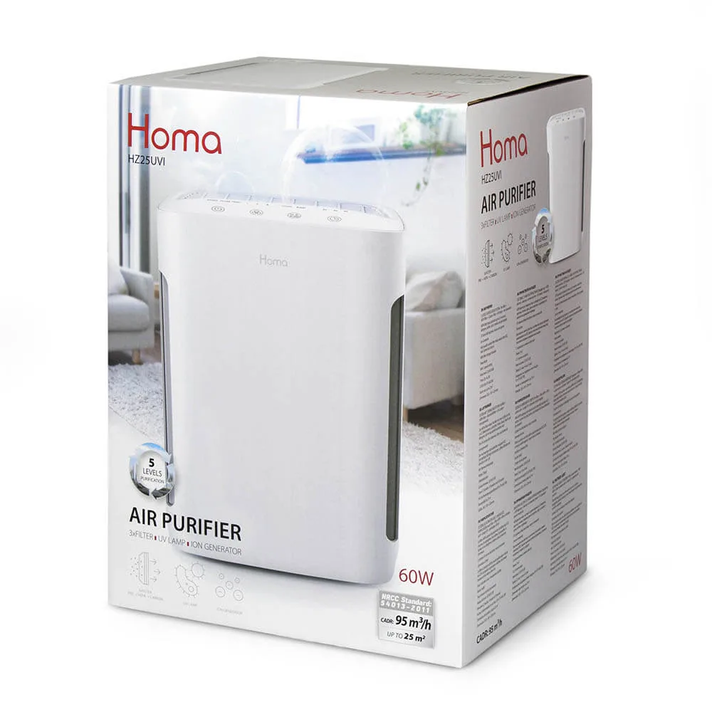 HOMA Air Purifier – 5-Stage Advanced Purification System Breathe cleaner, healthier air with the HOMA Air Purifier, designed to remove airborne pollutants and improve indoor air quality. Perfect for bedrooms, offices, and small living spaces, this purifier combines cutting-edge filtration with user-friendly features for year-round comfort. Key Features: 5-Level Purification System: Pre-filter + HEPA Filter + Carbon Filter + UV Lamp + Ion Generator Effectively removes dust, smoke, allergens, and harmful particles for fresher air. HEPA Filter: Captures particles as small as 0.3 microns, including pollen, pet dander, and fine dust. UV Lamp: Kills bacteria, viruses, and germs, ensuring a hygienic environment. Ion Generator: Releases negative ions to help neutralize airborne contaminants. High-Quality Carbon Filter: Reduces VOCs, toxic fumes, and unpleasant odours. Filter Change Indicator: Alerts you when it’s time to replace the filter for optimal performance. Sleep Mode: Operates quietly for uninterrupted rest. 3 Fan Speeds: Adjustable airflow levels (32/45/55 dB noise levels). Timer Function: Set for 2h, 4h, or 8h for convenience and energy efficiency. Specifications: Clean Air Delivery Rate (CADR): 95 m³/h (60 CFM) Recommended Room Size: Up to 25 m² Power: 60 W Voltage: 220–240 V Dimensions: 242 × 181 × 324 mm Experience a cleaner, fresher atmosphere every day with the HOMA Air Purifier — your reliable solution for pure indoor air.