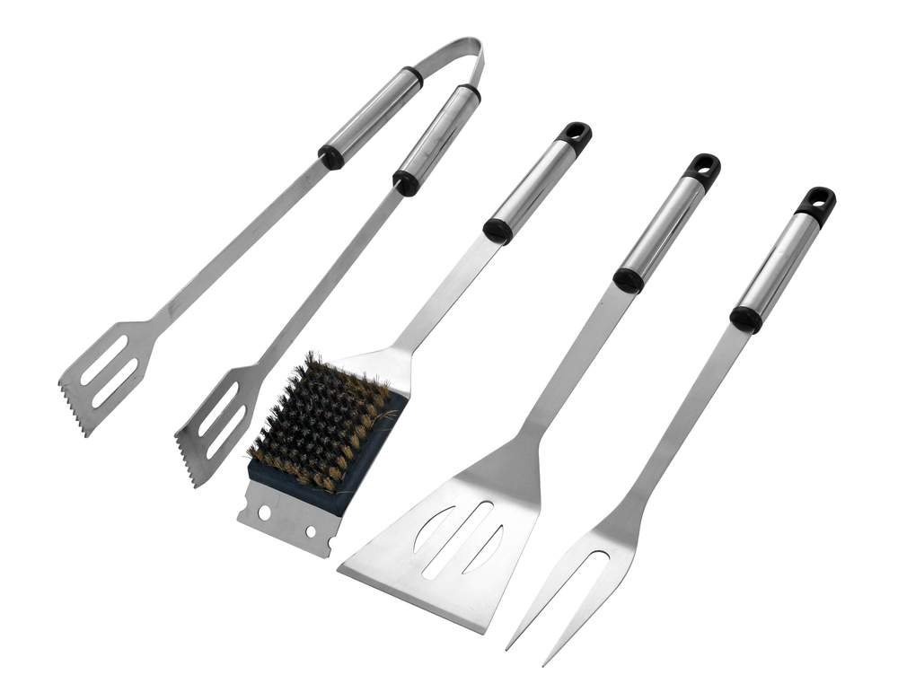 S/s set barbecue tool 4pcs The 4-piece set of grilling utensils includes brush, tongs, turner, and fork, made of stainless steel. The set includes the basic utensils needed for grilling. The utensils are equipped with hanging lugs.