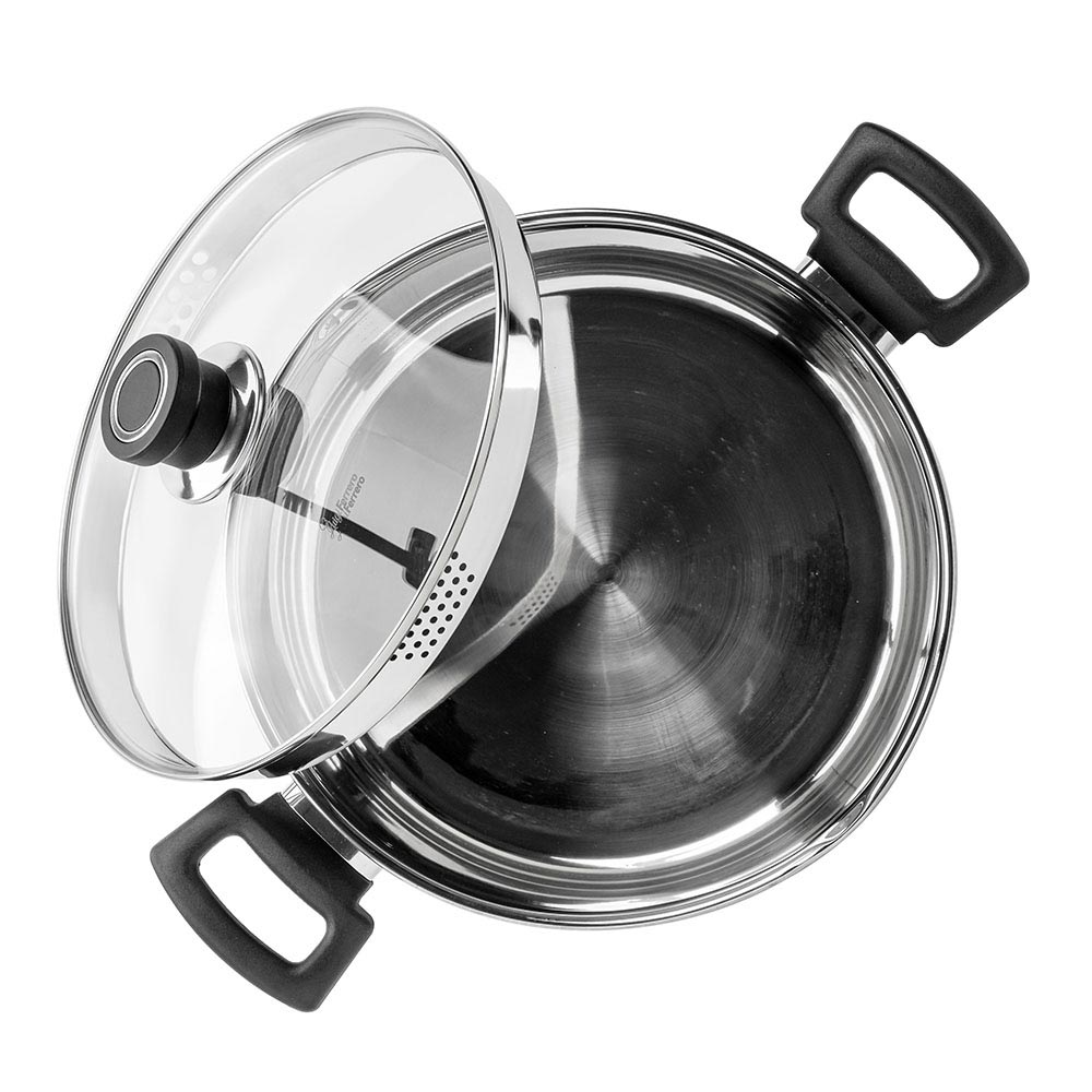 High quality 18/10 stainless steel Body thickness – 0.5mm Ergonomic and comfortable handles Lid for draining and spout Bottom – 2 mm Aluminum Suitable for all heating sources including induction Dishwasher safe
