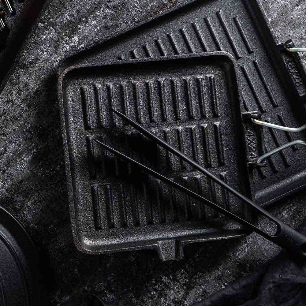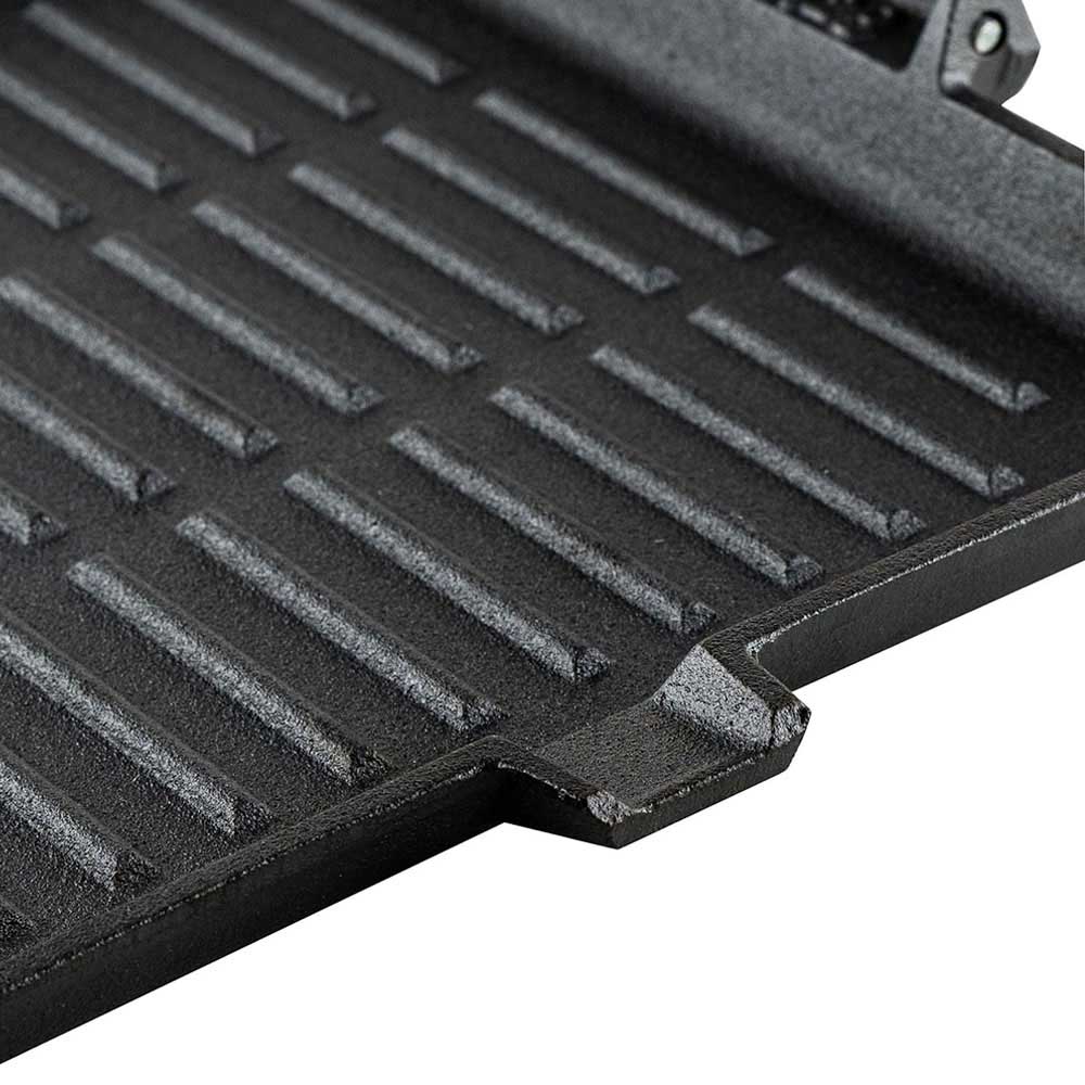 Cast iron grill pan. Pre-seasoned. High temperature capability – remains hot for a long time after heating. High emissivity – the surface releases a lot of thermal energy through emission, i.e. you not only cook the surface which is in contact with metal, but also the food above it. Suitable for all cooking hobs – electric, gas, ceramic, halogene and and indiction. Don’t use in the dishwasher.
