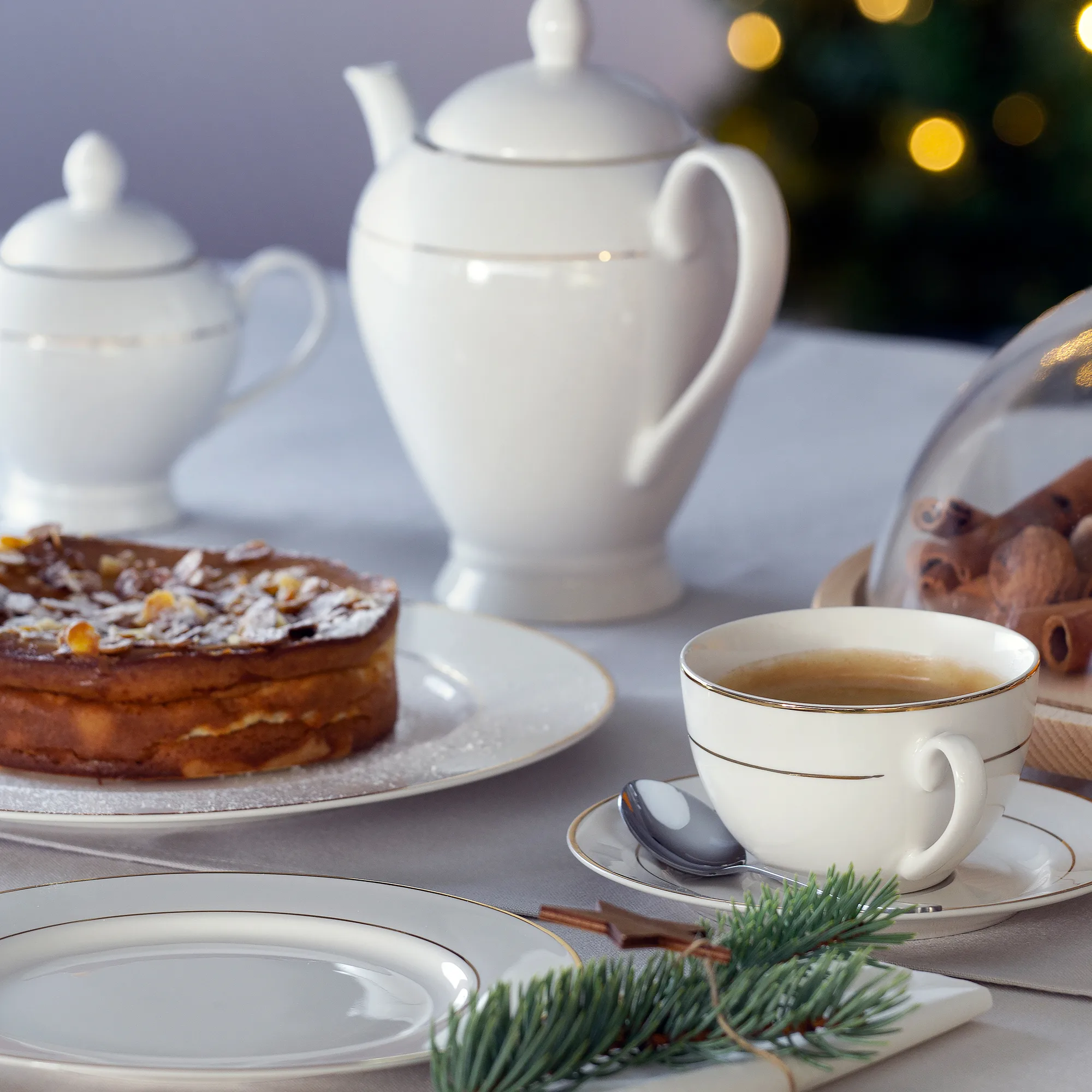 Porcelain tea pot – coffee pot Elegant and practical at the same time, it’s perfect for preparing coffee or tea for the whole family. The delicate gold line that runs around its top adds a touch of elegance and sophistication. Its ergonomic handle allows for comfortable holding and tilting when serving tea . The white teapot is easy to clean, durable, and scratch-resistant. Its elegant appearance makes it a wonderful addition to any table setting. Practical handle Elegant gold decoration Classic form Due to the design, we do not recommend washing in a dishwasher or using in a microwave.