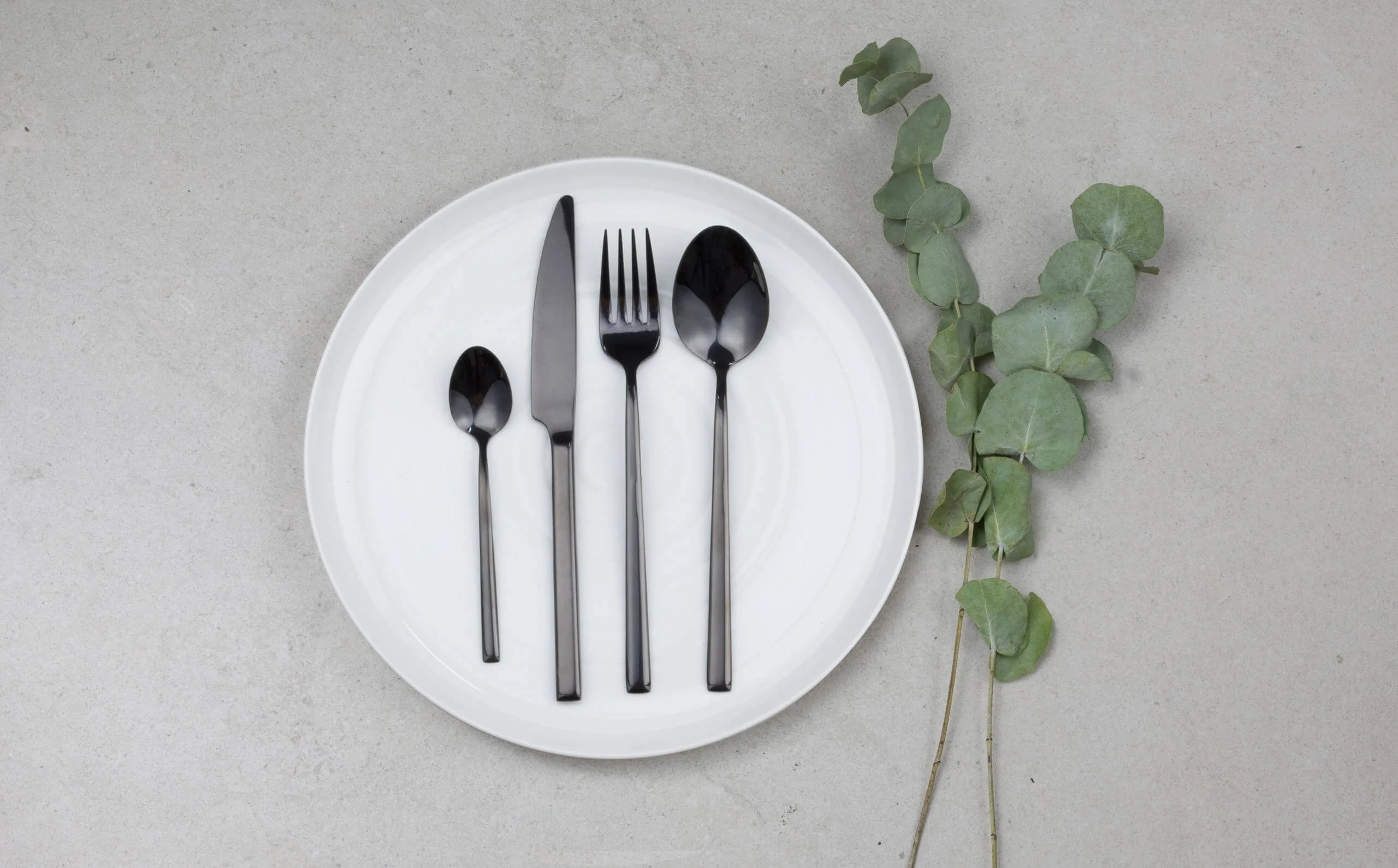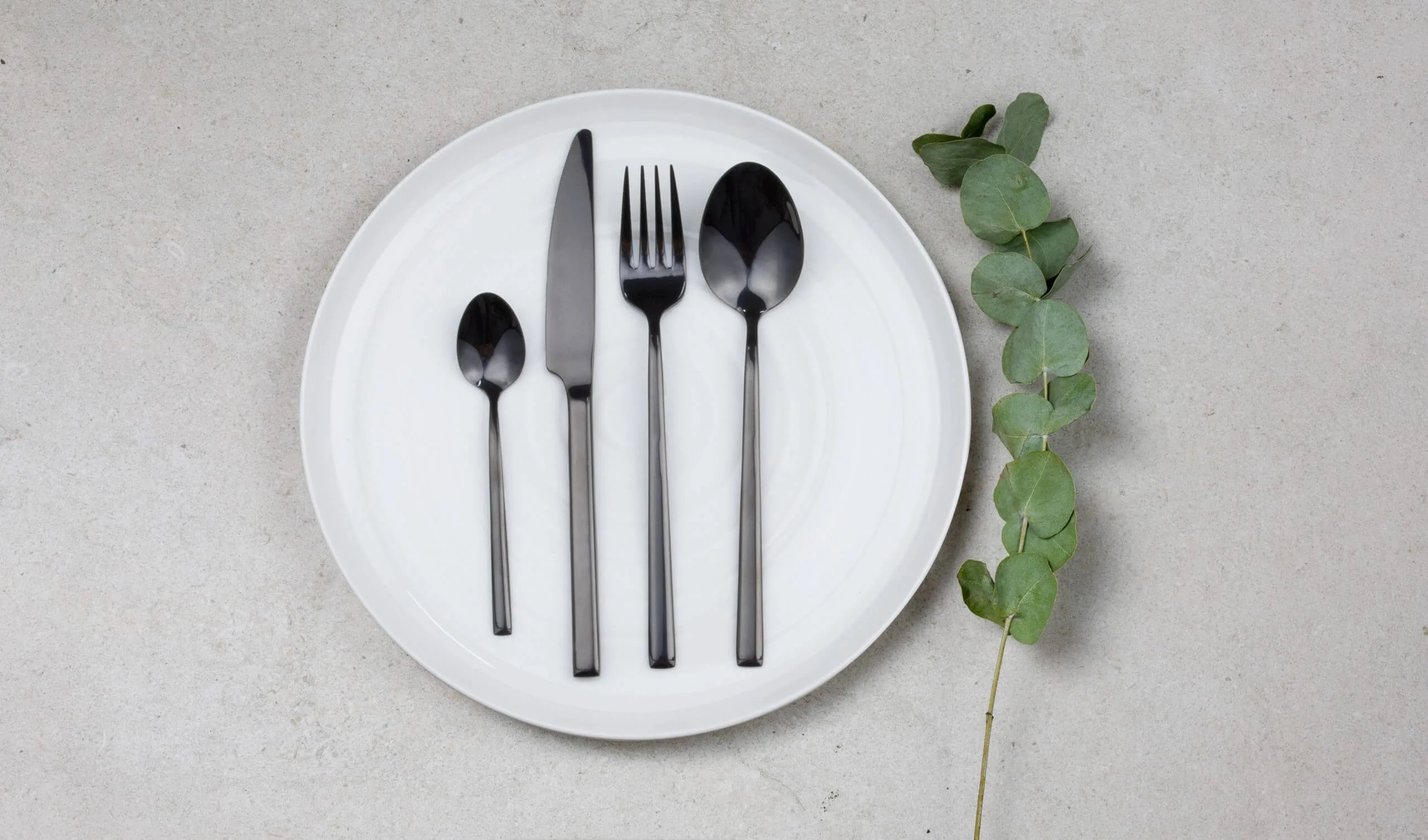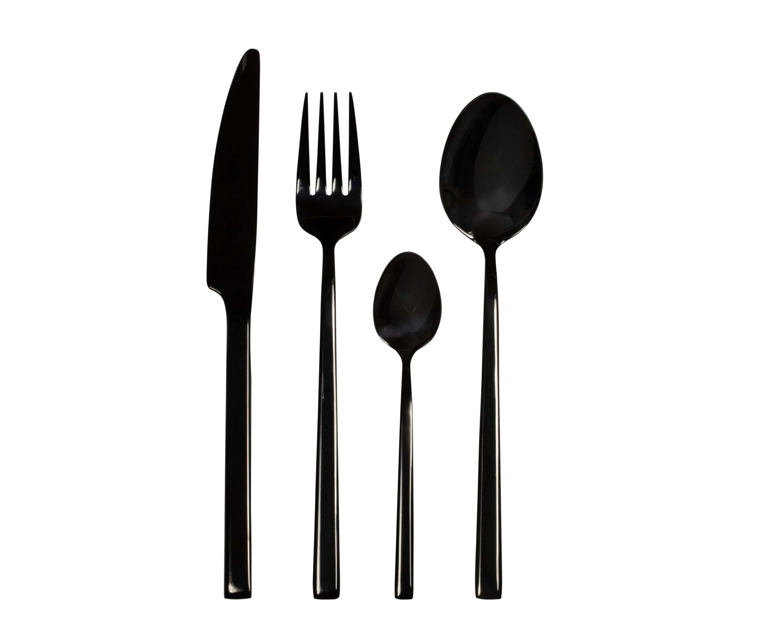Good quality black cutlery This 24-piece black cutlery set from the Como series features a minimalist design . The narrow, well-balanced handles complement both modern and classic tableware beautifully. Crafted from high-quality stainless steel, hand-polished with a mirror finish, each piece is dishwasher safe . Packaged in a colorful gift box, they make a great gift . Hand-polished stainless steel Mirror finish Slim handle Handy and comfortable to use Dishwasher safe Packed in a Gift Box – a great gift idea! Available in three colors Set composition: 6 x fork 20.8 cm 6 x knife 23 cm 6 x spoon 20.6 cm 6 x teaspoon 14.2 cm