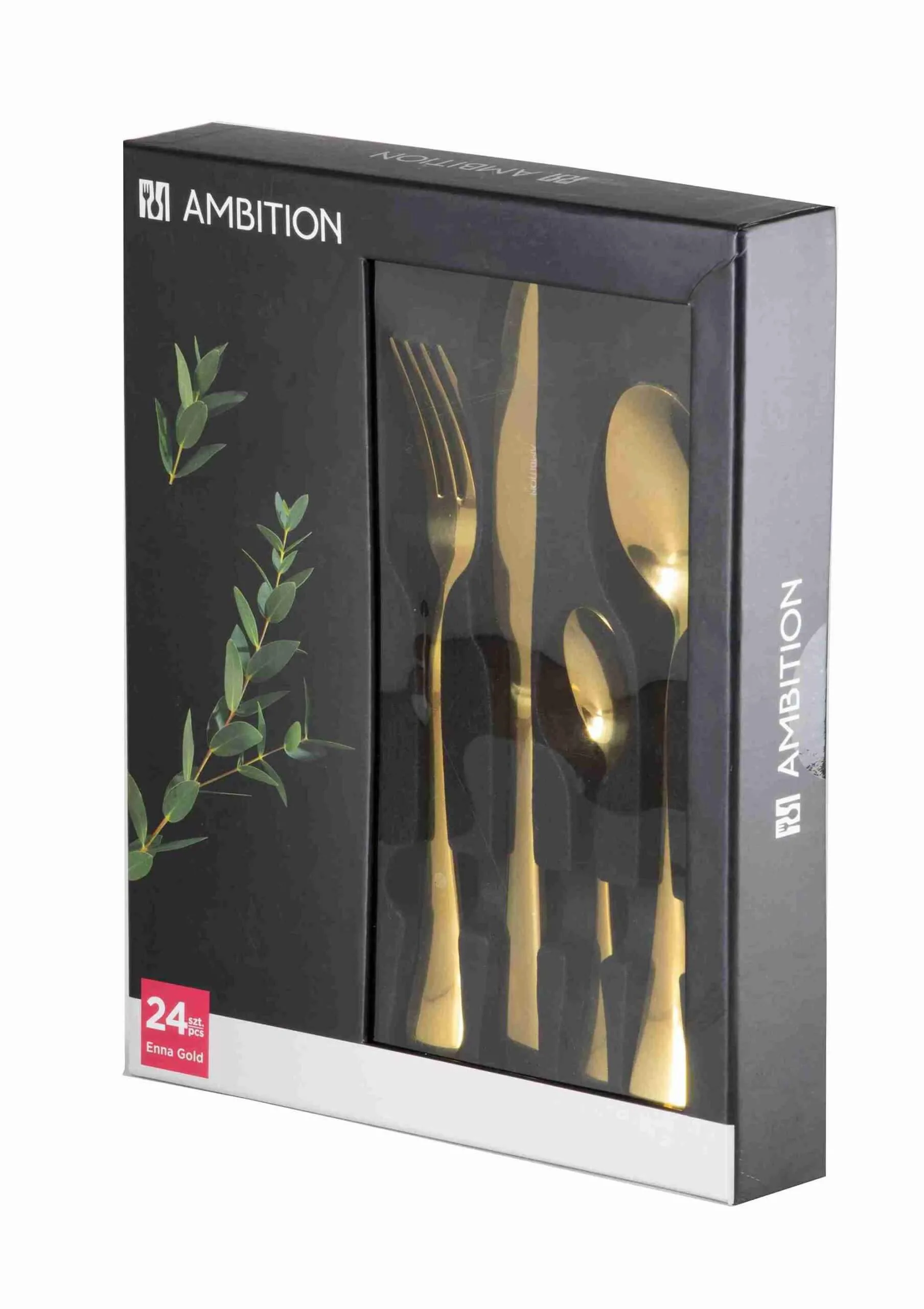 This 24-piece gold cutlery set from the Enna Gold series features a minimalist design. The cutlery’s design complements both modern and classic tableware beautifully. Crafted from high-quality, hand-polished stainless steel, it has a mirror-like finish. The 24-piece cutlery set includes: 6 x 20.5 cm forks, 6 x 23.3 cm knives, 6 x 20.5 cm spoons , and 6 x 13.8 cm teaspoons. Details Thickness of individual cutlery: spoon/fork – 2.5 mm teaspoon – 2.0 mm knife – 5.0 mm