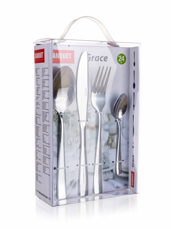 24 pcs cutlery set GRACE The GRACE 24-piece set of utensils contains: 6x tablespoons, 6x forks, 6x knives and 6x teaspoons. Material: 18/0 stainless steel, surface finish: mirror polish, steel thickness: tablespoon 2.0 mm, fork 2.0 mm, knife 3.0 mm, teaspoon 2.0 mm.