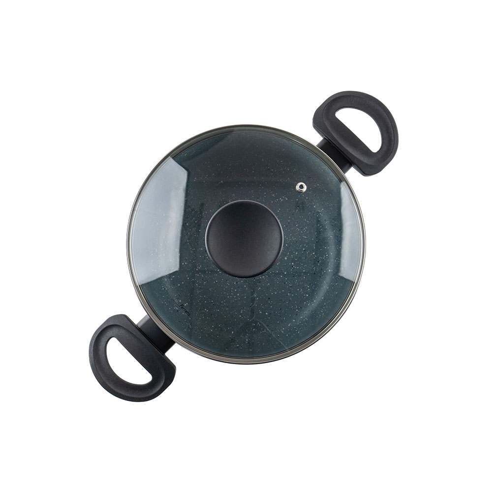 High quality pressed aluminum. Thickness – 2.5 Durable marble non – stick coating. Suitable for electrical, gas, ceramic, halogen and induction hot plates. Dishwasher safe. Suitable for healthy cooking without fat. Easy cleaning.