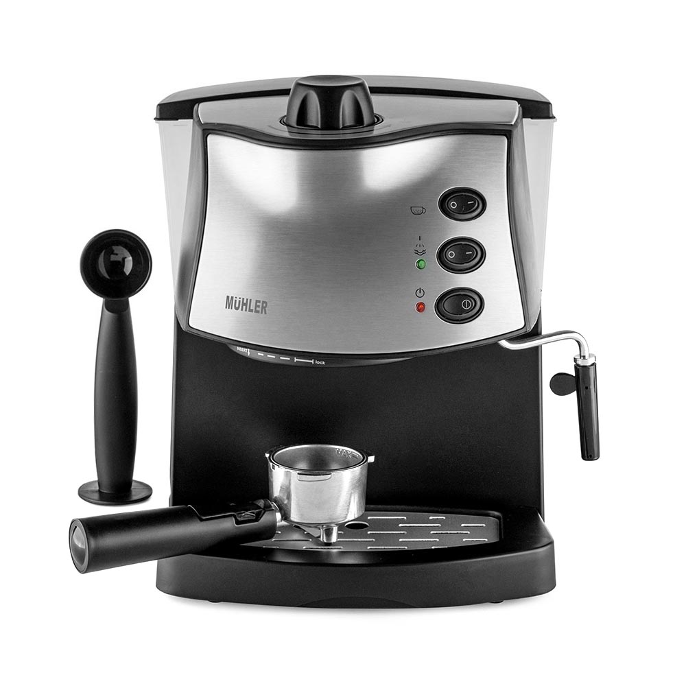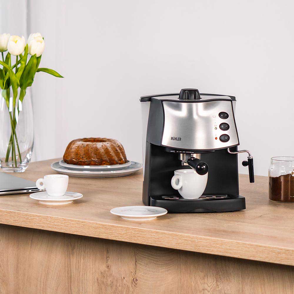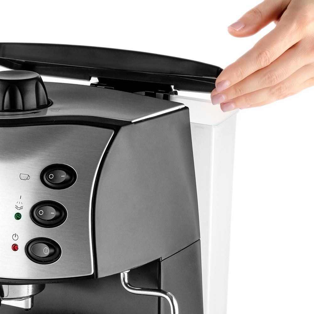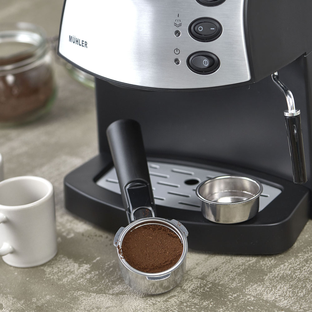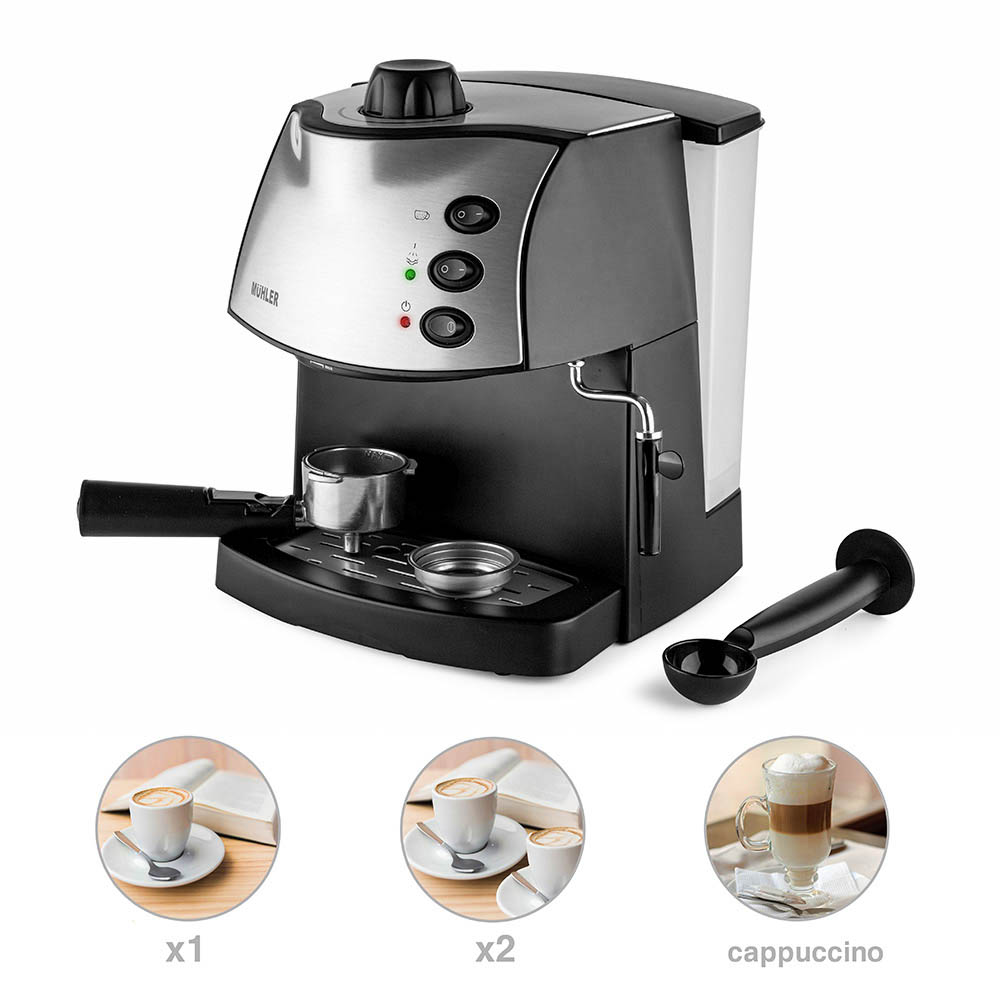 Espresso machine Constant pressure pump (15 Bar) 1.8 l removable water tank Double metal filter for perfect aroma, taste and cream Removable steam nozzle for cappuccino or other hot drinks Light indicators for pump and steam readiness With reliable protection against overheating and high pressure Removable drip tray Stainless steel panel Automatic shut-off up to 9 min. Accessories: Handle with filter holder Double filter for ground coffee Measuring spoon ESE filter for paper coffee pods 850W, 220-240V/50-60Hz
