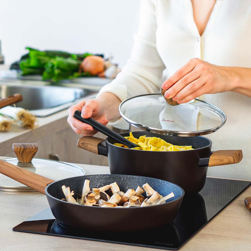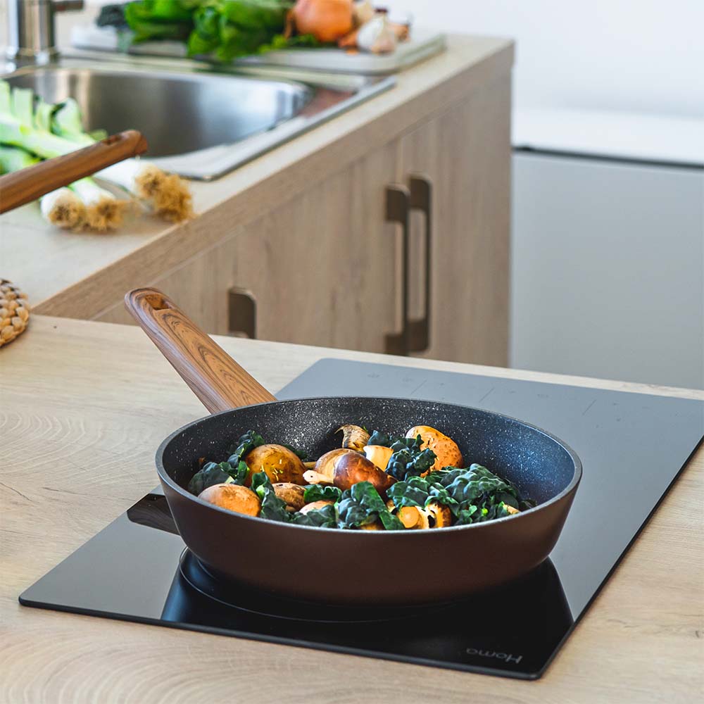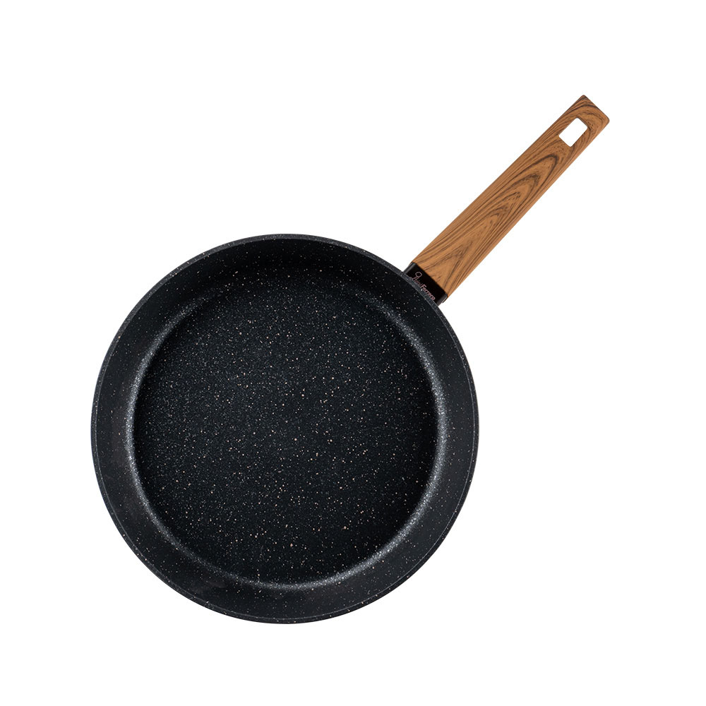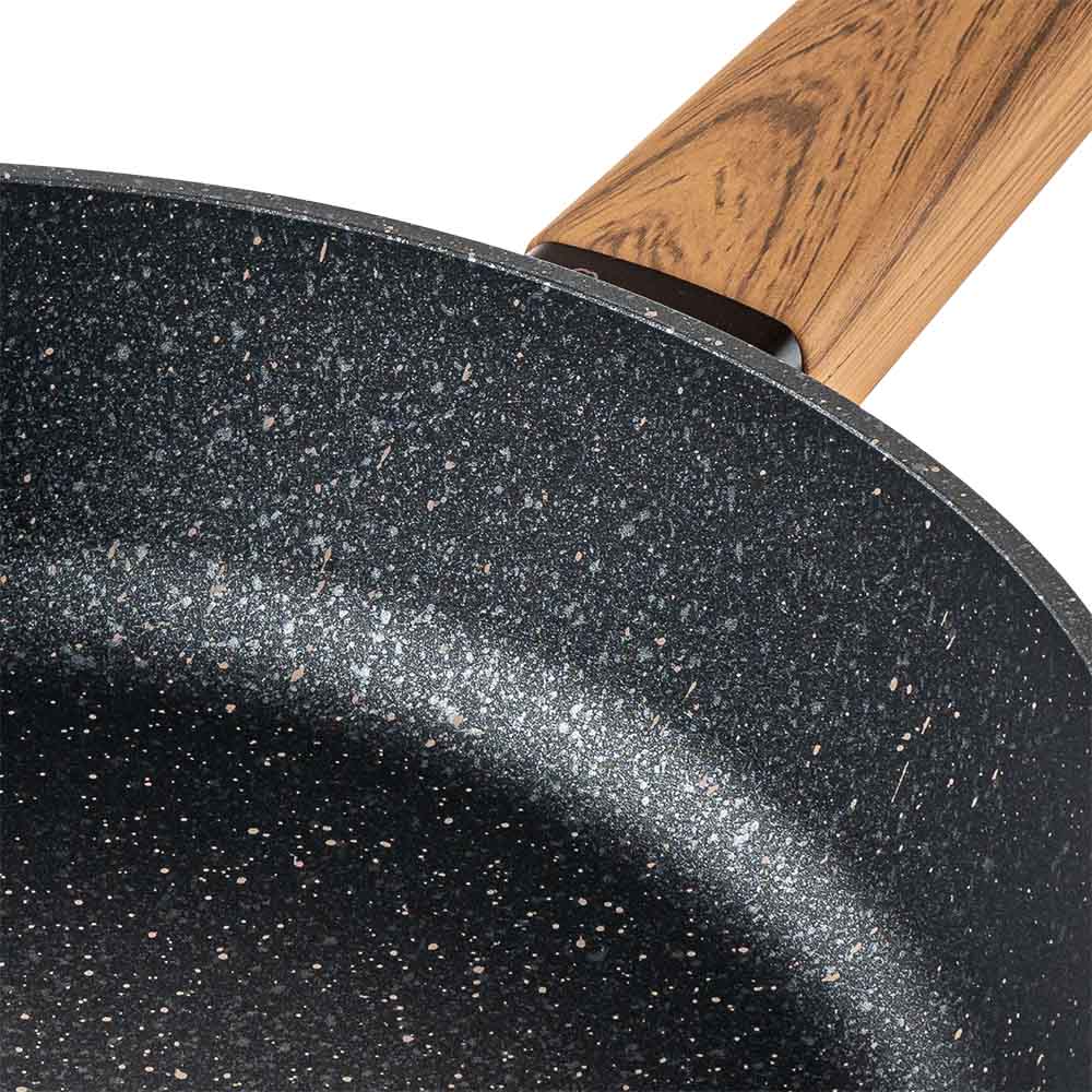 High quality forged aluminum. Wall thickness – 4?? Bottom thickness – 4.5?? Durable marble non – stick coating. Suitable for all heating sources – electrical, gas, ceramic, halogen and induction hot plates. Dishwasher safe. Suitable for healthy cooking without fat. Easy cleaning.