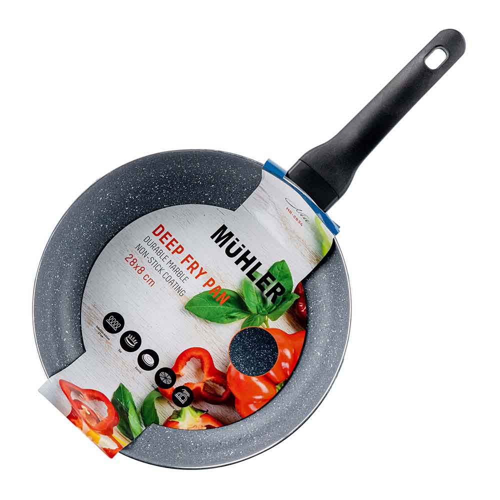 High quality pressed aluminum. Thickness – 2.5mm Durable marble non – stick coating. Suitable for electrical, gas, ceramic, halogen and induction hot plates. Dishwasher safe. Suitable for healthy cooking without fat. Easy cleaning.