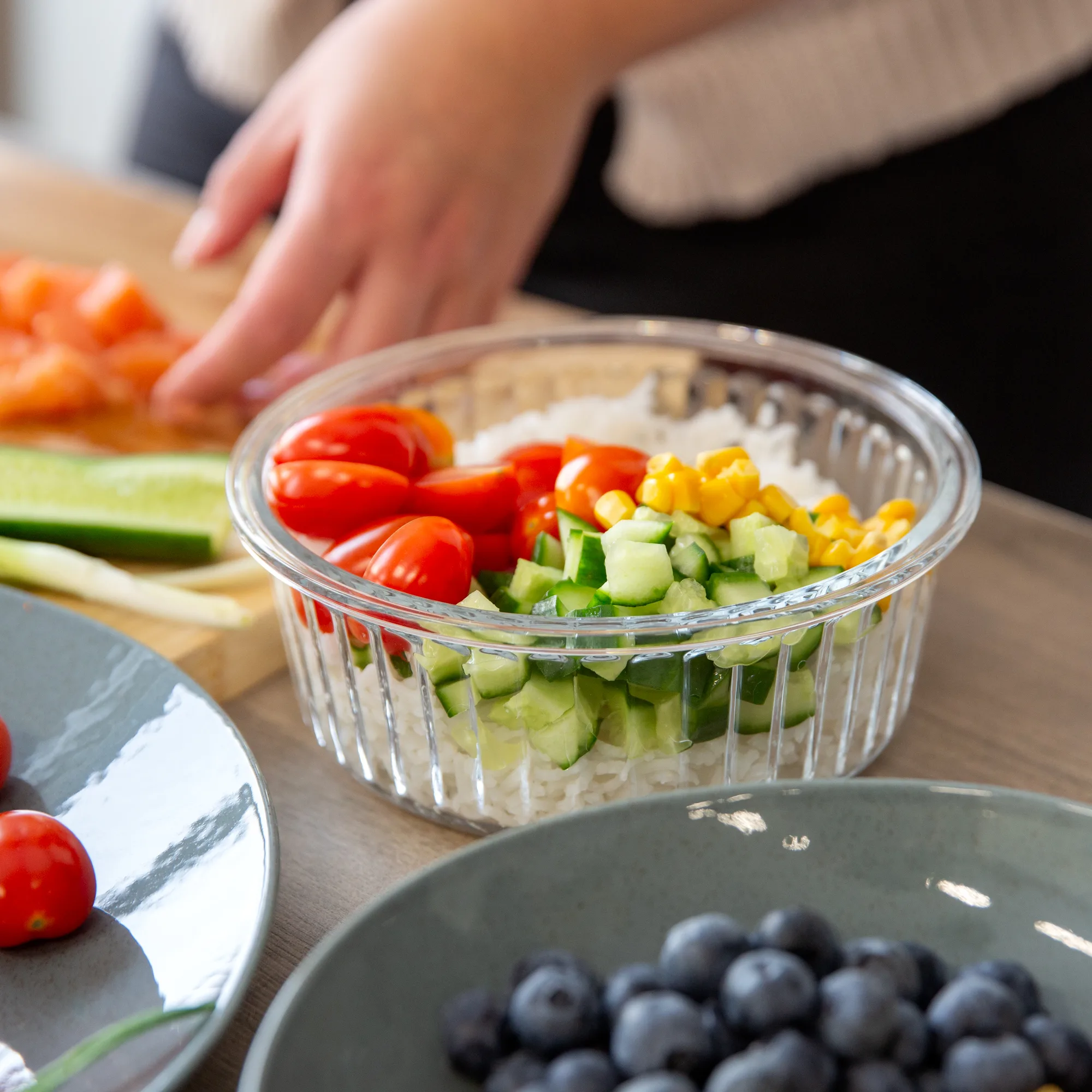 Round container with lid Looking for a container that’s perfect for both storage and baking? This round, oven-safe glass container with a lid and vent is the perfect choice. It can bake at temperatures up to 220°C (420°F) and freeze down to -20°C (-4°F), giving you complete freedom in meal preparation. Its airtight seal makes storing food safe and convenient, and the vent allows you to reheat meals in the microwave without opening the lid. The container adapts perfectly to various spaces in the refrigerator or cupboard, making kitchen organization easier. Heat-resistant glass : ideal for baking at high temperatures Freezing : Safe to store in the freezer down to -20°C Lid with vent : allows heating without removing the lid Fluted glass : a stylish and functional addition to your kitchen Dishwasher safe