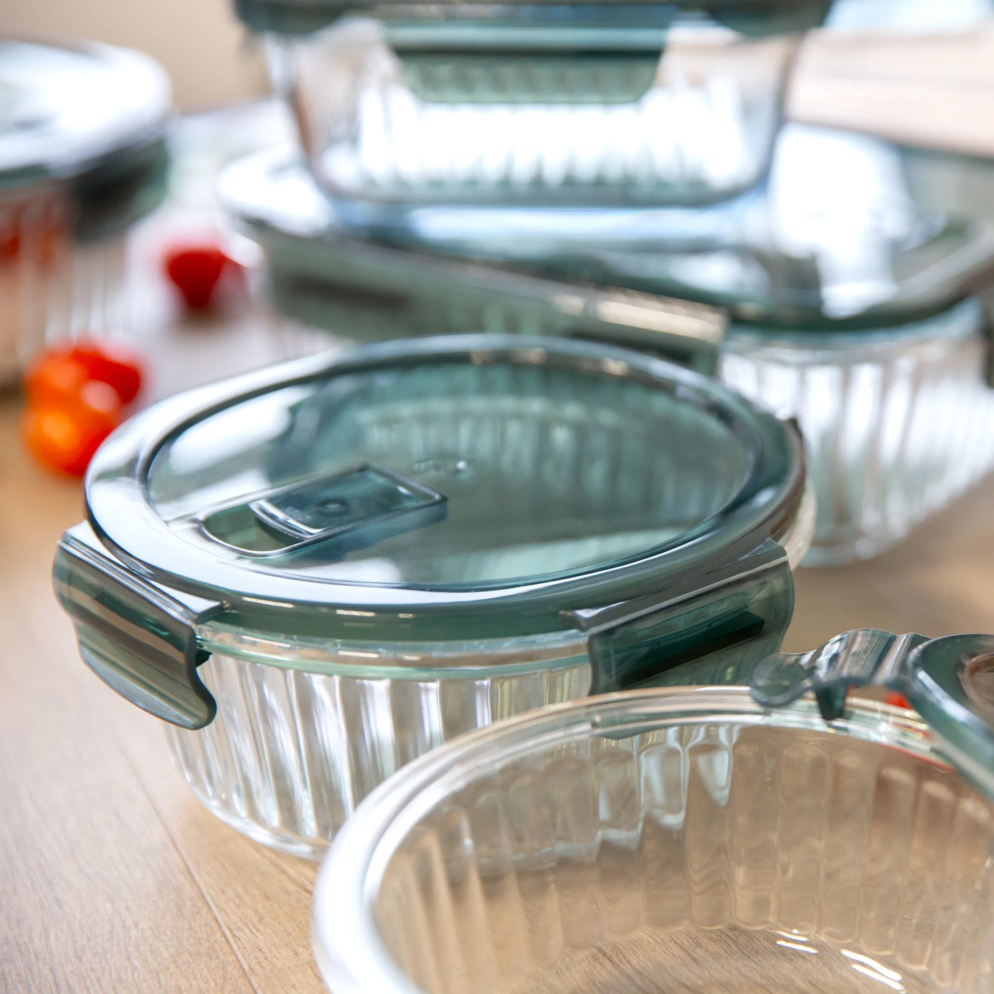 Glass food container This round container made of heat-resistant glass is the perfect solution for storing and preparing food. You can safely bake in it up to 220°C (420°F) and freeze it down to -20°C (-4°F), making it incredibly versatile. Equipped with a sealing lid with a vent, it allows for safe storage and microwave reheating without having to remove the lid. Its round shape allows the container to easily fit in the refrigerator, cupboard, or drawer, optimizing space. Heat-resistant glass : withstands temperatures up to 220°C Freezing option : can be frozen to -20°C Vent : allows microwave heating without opening the lid Aesthetic design : decorative grooves perfectly match the kitchen decor Easy to clean : dishwasher safe