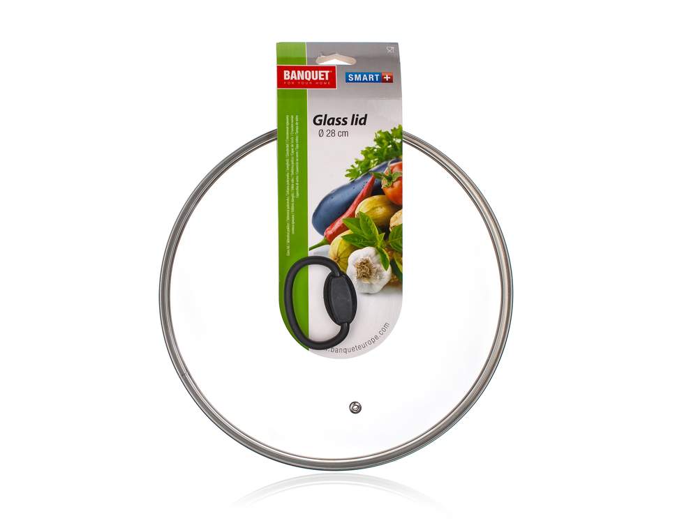 Glass lid 26cm, Smart Plus The SMART Plus glass lid, 26 cm, is designed for pans and pots of diameter of 26 cm. The lid is made of high-quality hardened glass and completed with a heat-resistant nylon handle that can be folded down during storage, saving the storage space. The glass is fitted with an opening for excess vapor removal.