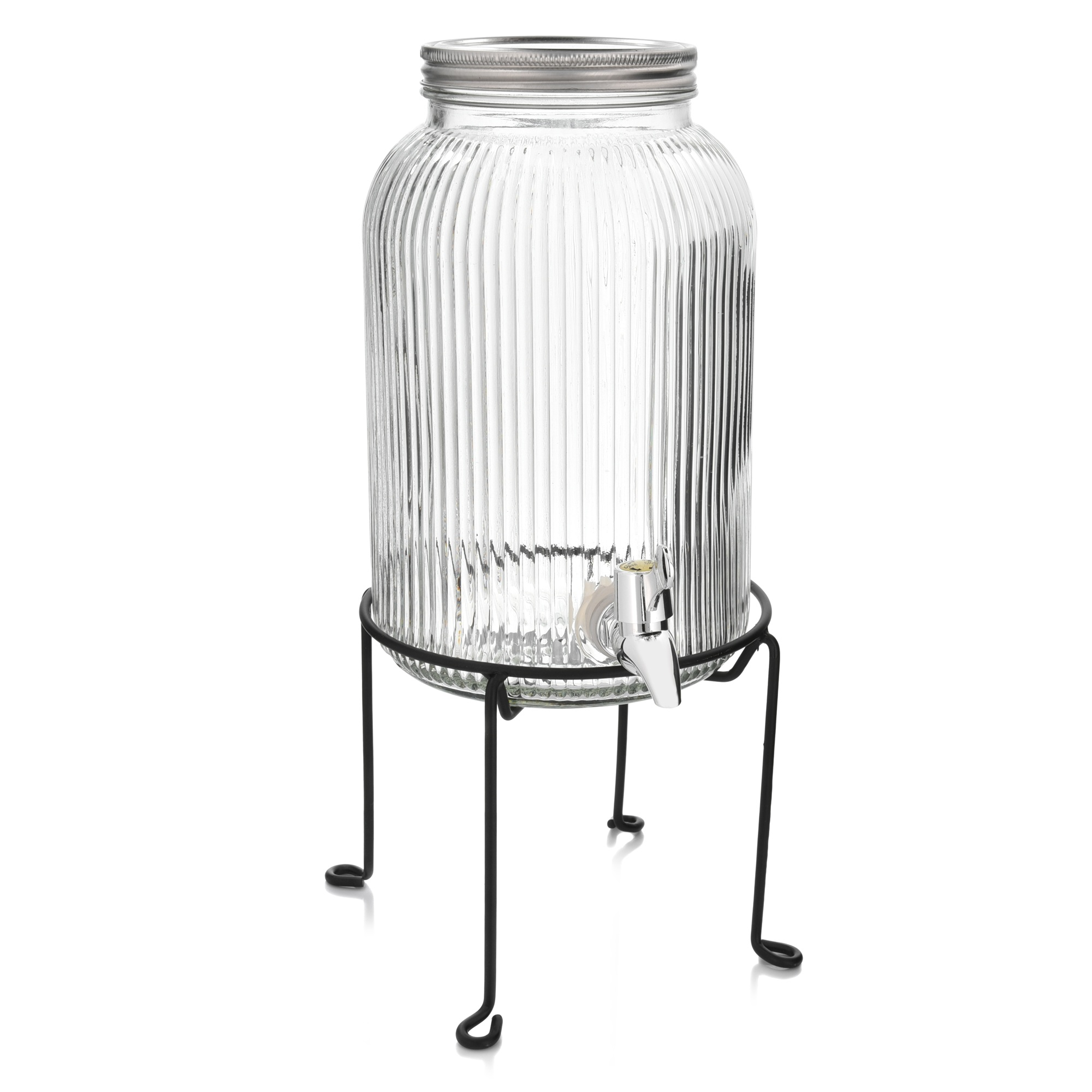 A jar with a tap for lemonade or water This 4-liter dispenser is a functional and aesthetically pleasing vessel for serving cold drinks during social gatherings, garden parties, or everyday use at home. Made of transparent glass with vertical ribs, it looks exceptionally elegant and allows for an effective presentation of its contents—for example, citrus lemonade, mint water, or homemade iced tea. The jar with a tap features a leak-proof tap and a metal lid, and the whole thing sits securely on a stand that makes pouring easy without having to lift the container. It’s a practical and stylish addition to any kitchen or dining room. Capacity: 4 liters – perfect for larger gatherings and home parties Material: glass with vertical embossing, metal lid Stand: stable metal structure that lifts the dispenser Tap: a practical valve for easy pouring of the drink Design: elegant form, transparent glass presenting the contents Application: for cold drinks – lemonade, water, tea, juices