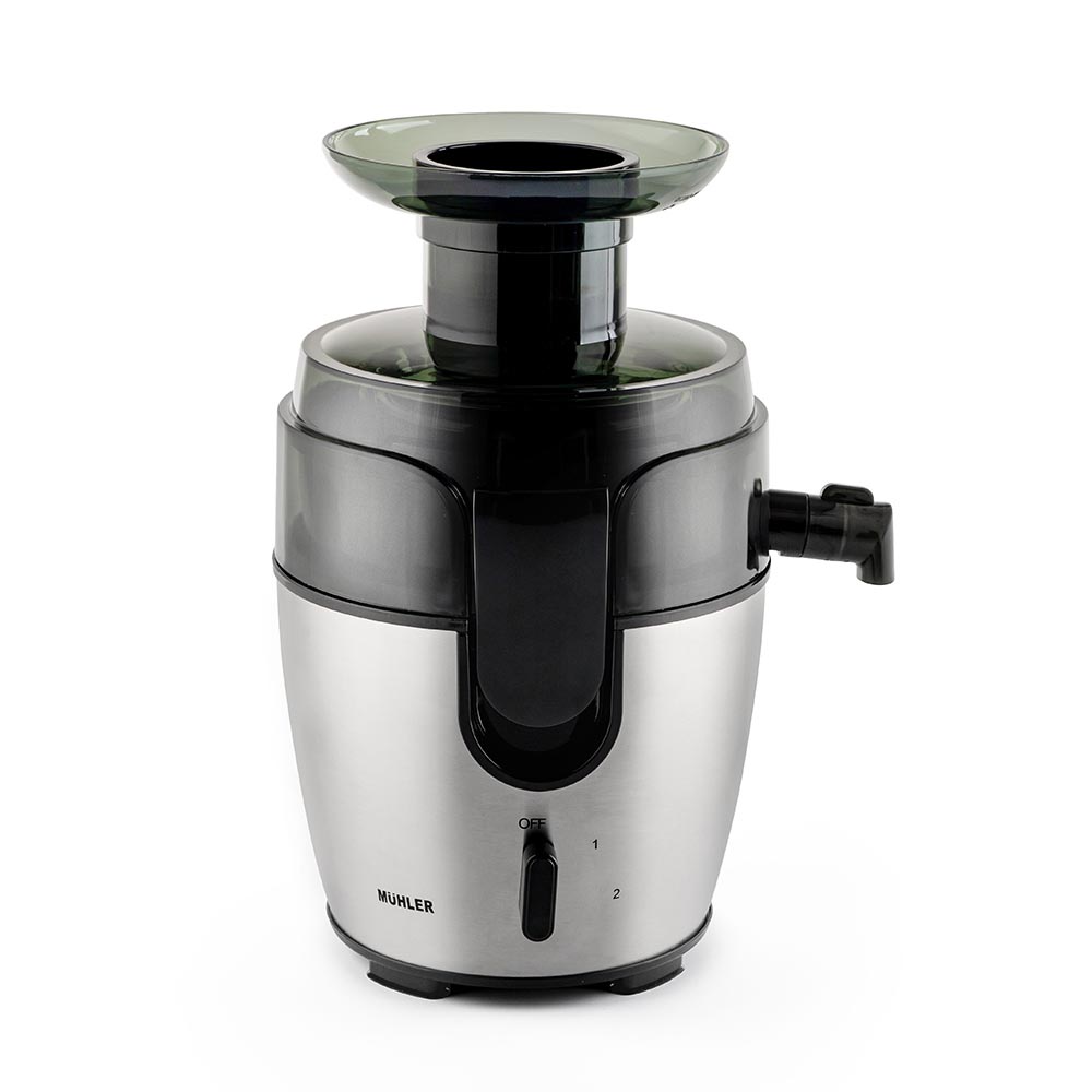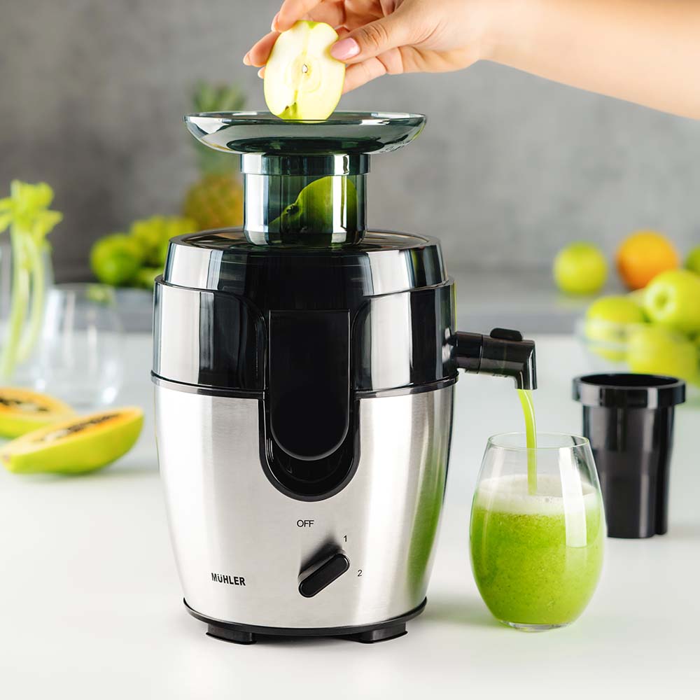 Stainless steel housing Fruit opening width – 65 mm Waste container Stainless steel strainer Powerful motor Compact design Two speeds for operation Anti-slip rubber feet Device dimensions: 32x24x19 cm 600W, 220-240V, 50-60Hz
