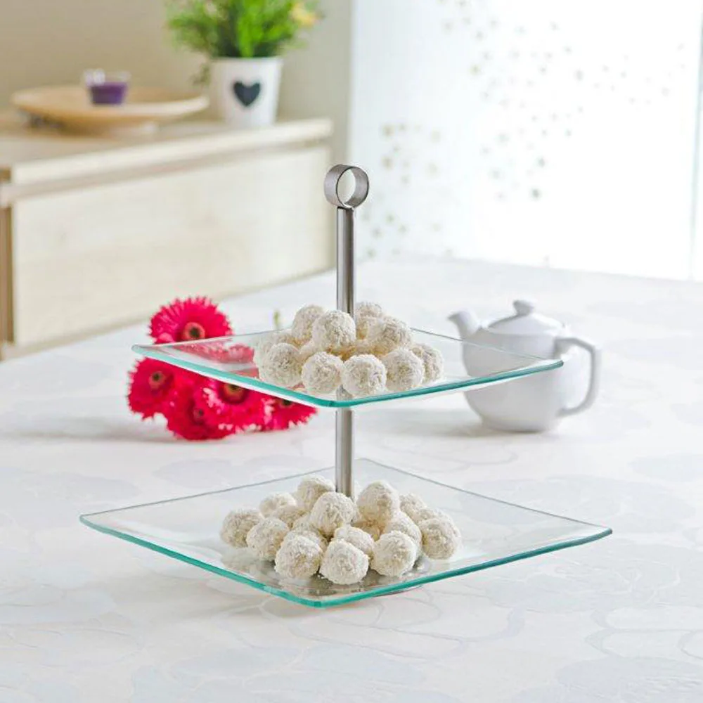 Present your desserts with elegance using the Laura Two-Tier Square Platter 24 × 24 cm AMBITION. Stylish and functional, this compact cake stand is perfect for serving sweet treats at home or during special occasions. Crafted from high-quality glass plates and a durable stainless steel frame, the Laura two-tier platter is ideal for displaying cupcakes, cakes, chocolates, doughnuts, fruit, and other desserts. Its minimalist, timeless design blends beautifully with any table setting, making it suitable for family gatherings as well as weddings, banquets, buffets, and restaurant service. The stand features easy assembly and disassembly for convenient storage. The smooth glass surface allows for quick and thorough cleaning after use. The product is packaged in the manufacturer’s original box, making it a great gift idea. Product Features: Two-tier square design High-quality glass plates Sturdy stainless steel construction Elegant and versatile style Easy to assemble and disassemble Smooth surface for easy cleaning Original manufacturer’s packaging Dimensions: 1st level: 19.5 × 19.5 cm 2nd level: 24 × 24 cm