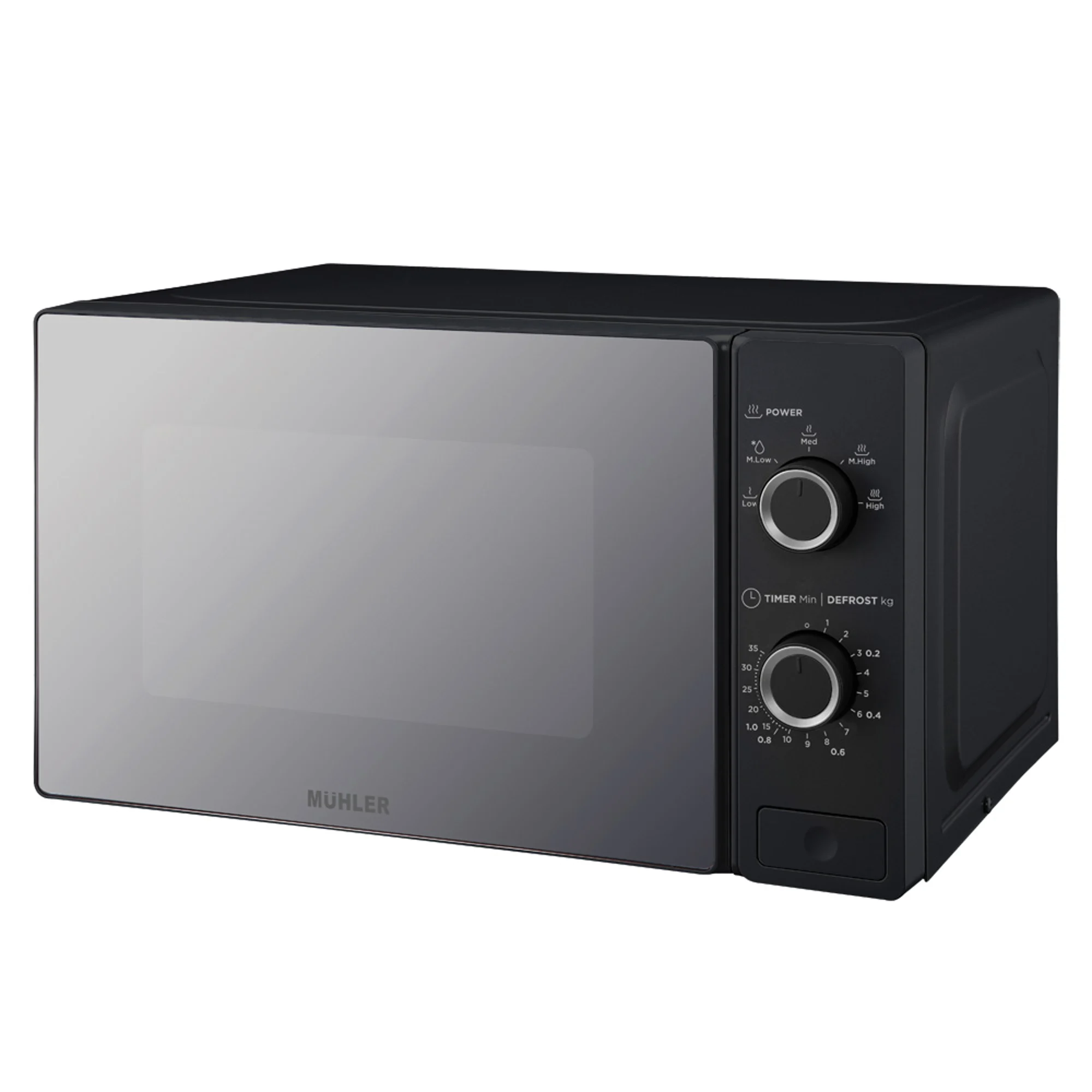 MUHLER Microwave Oven 700W – Mechanical Control, 5 Power Levels, 20L The MUHLER Microwave Oven 700W combines reliable performance with a sleek mirror panel finish, making it a stylish and practical addition to any modern kitchen. Designed with easy-to-use mechanical controls, it offers simple and efficient cooking for everyday meals. With 5 cooking power levels and a convenient defrost function, this microwave allows you to heat, cook, and thaw food quickly and evenly. The 35-minute timer ensures precise cooking control, while the end-of-cooking signal alerts you when your food is ready. Key Features: Power: 700W Voltage: 220–240V, 50–60Hz Mechanical control knobs for easy operation 5 cooking levels for versatile use Defrost function 35-minute timer Rotating glass plate (255 mm diameter) for even heating End-of-cooking signal Mirror panel finish for a modern look Convenient door open button Dimensions: Unit size: 44 × 26 × 35 cm