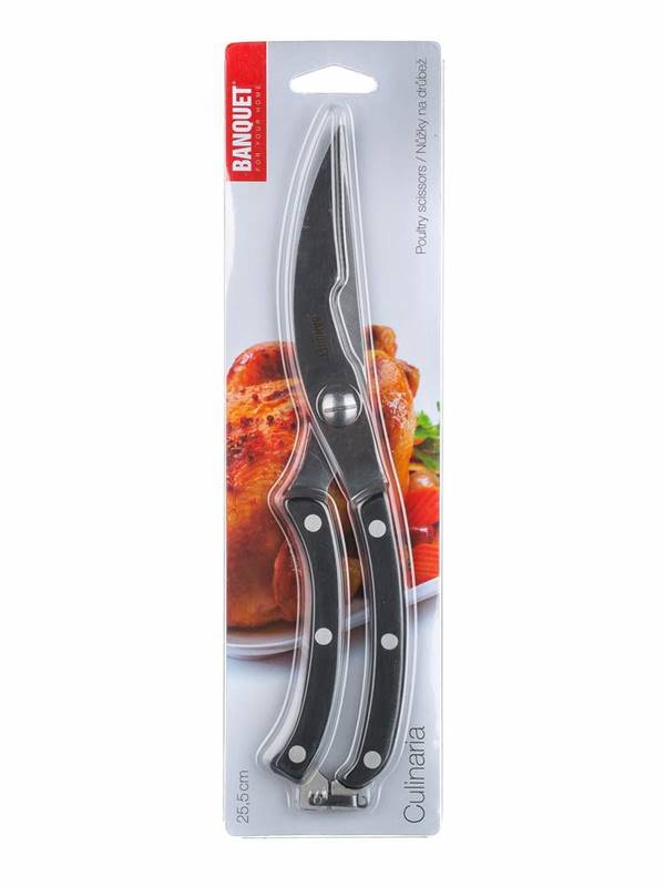 Poultry scissors CULINARIA 25,5cm black handle The CULINARIA poultry scissors, 25.5 cm, are fitted with a curved cutting edge for easy handling and fast carving of poultry. The scissors are made of steel, the smooth ergonomic handles are made of plastic in black and provided with a safety lock at their end.