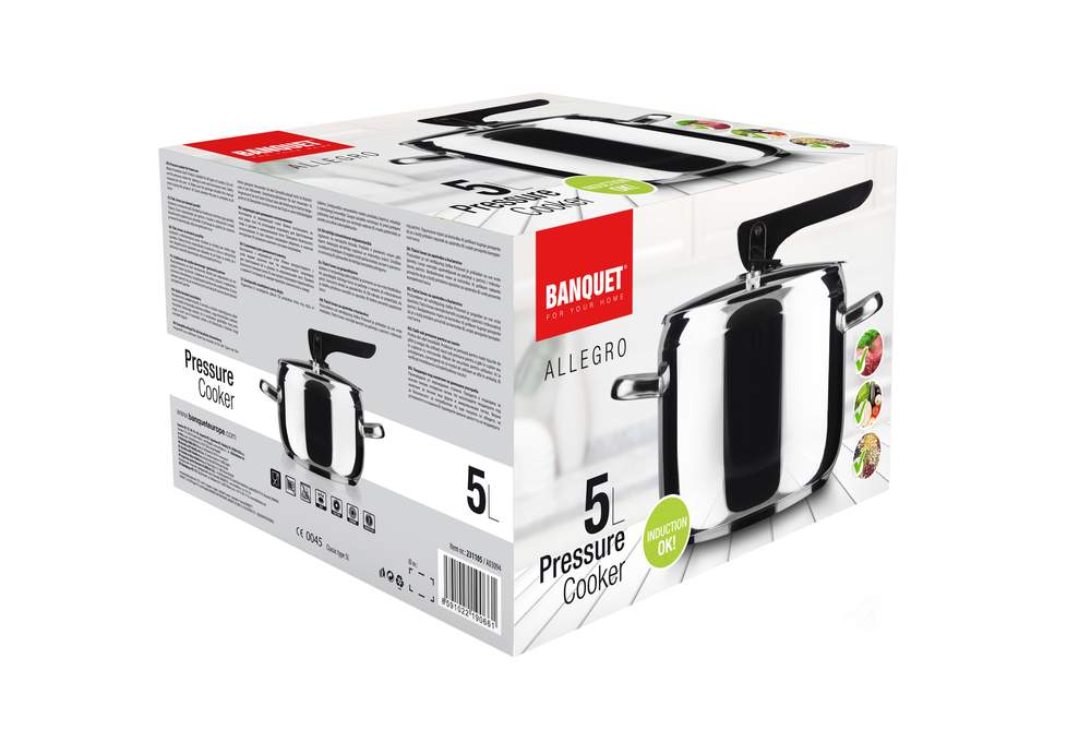 Pressure cooker 5l The stainless steel pressure cooker, 5 l, with a lever lock, diameter of 20.8 cm, height of 15 cm, stainless steel 18/0, wall thickness of 0.6 mm, 2 valves, thick sandwich bottom. The lid includes two valves, a main working valve, and an auxiliary/safety valve. The pressure cooker is designed for fast dish preparation and can be used on all types of hobs including induction. The lid of the pressure cooker includes a main working valve and an auxiliary valve for the case of clogging of the working valve, which makes the pot as safe as possible! The cooker is made of solid material, has a thick bottom and can be used on all types of hobs.