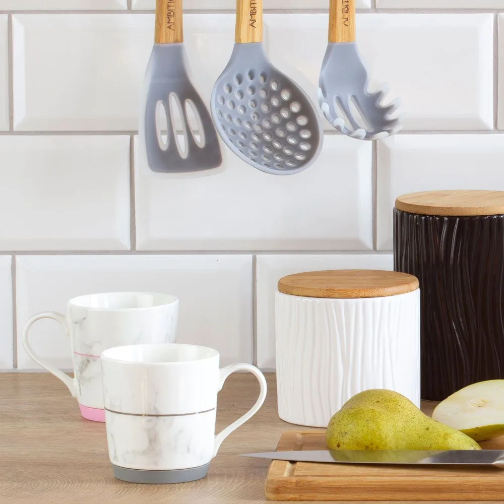 The Tuvo 1110 ml ceramic container is an excellent way to conveniently and aesthetically store bulk foods. It features a bamboo lid that ensures a tight seal and safe storage of items such as pasta, rice, or flour. It also looks beautiful on modern kitchen countertops, serving as a decorative element. The modern, round Tuvo containers are available in three designs. All are decorated in subdued black and white, complementing both minimalist and modern interiors.