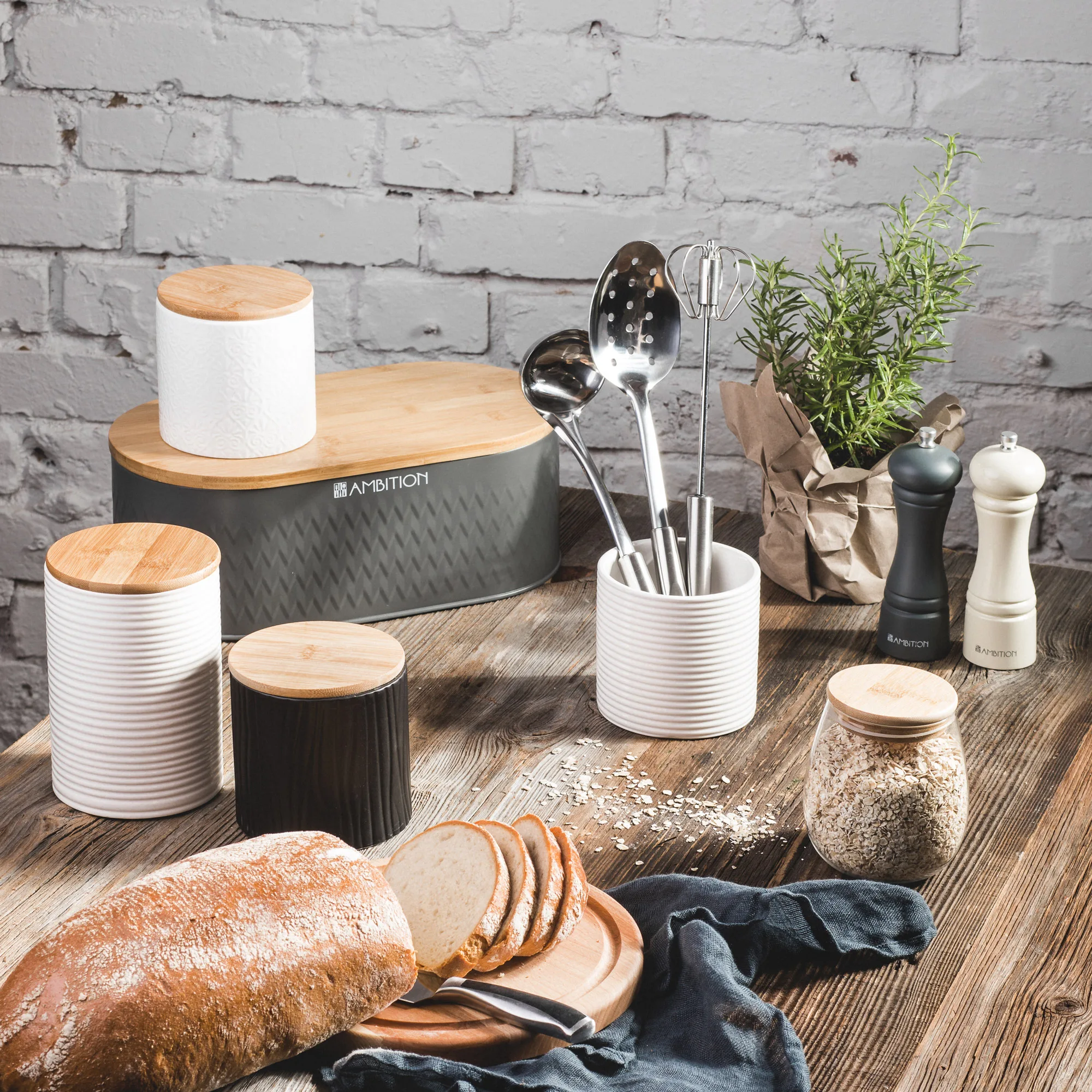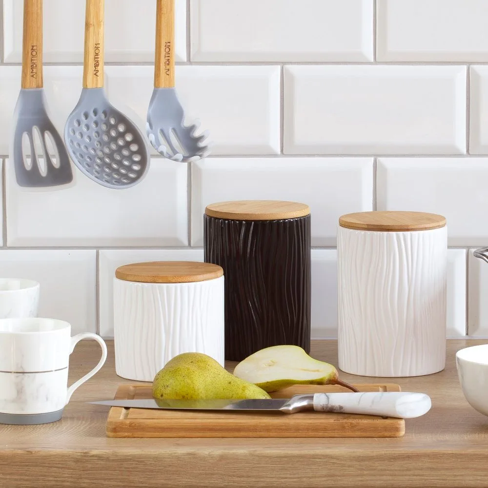 The Tuvo 1110 ml ceramic container is an excellent way to conveniently and aesthetically store bulk foods. It features a bamboo lid that ensures a tight seal and safe storage of items such as pasta, rice, or flour. It also looks beautiful on modern kitchen countertops, serving as a decorative element. The modern, round Tuvo containers are available in three designs. All are decorated in subdued black and white, complementing both minimalist and modern interiors.
