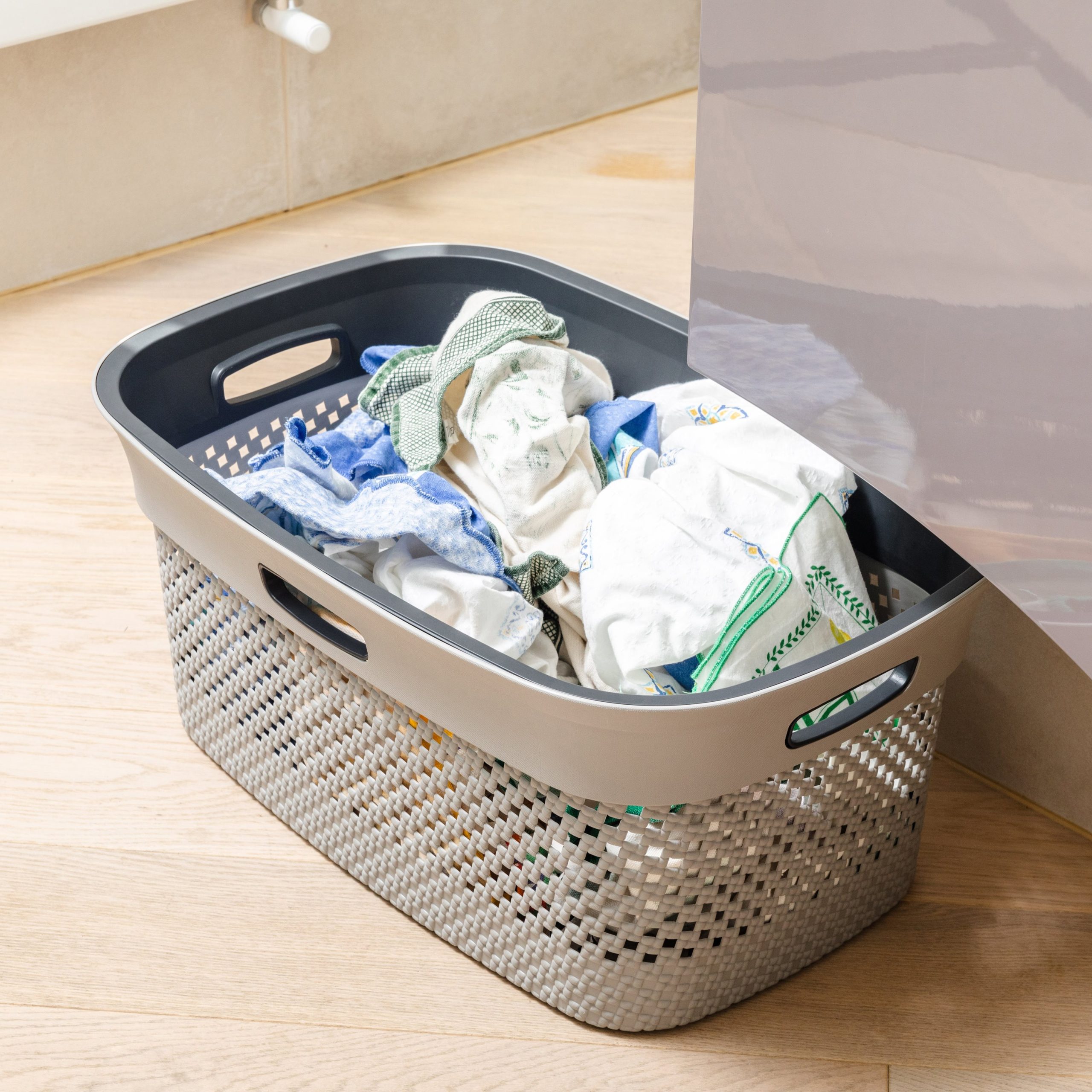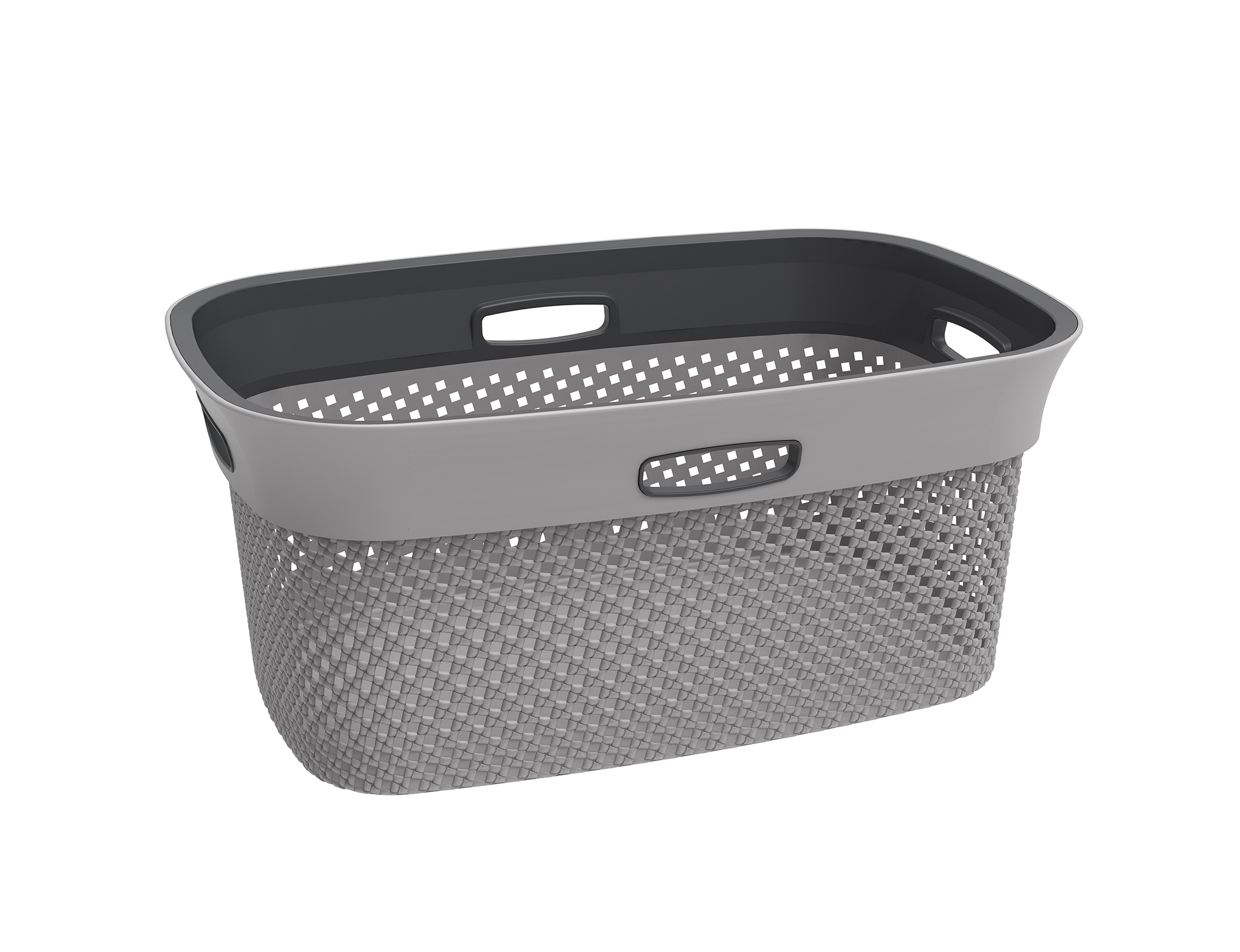 Laundry basket with handles, available in two colors. Its design recalls braided wool and adds a touch of color and comfort to the room. Its handles provide easy carrying. Made of high-quality plastic, it conveys both style and functionality. Volume: 45L Dimension: cm 59x39x26h
